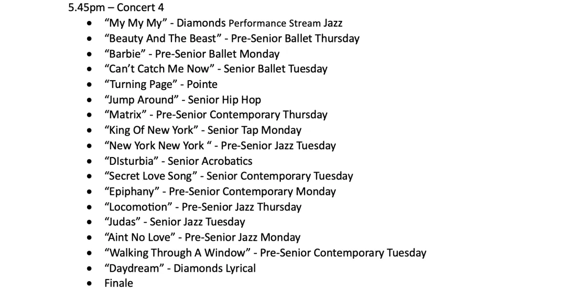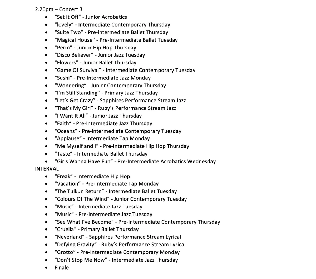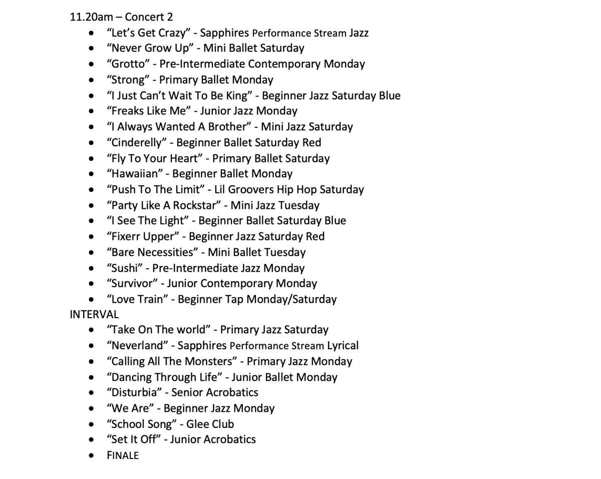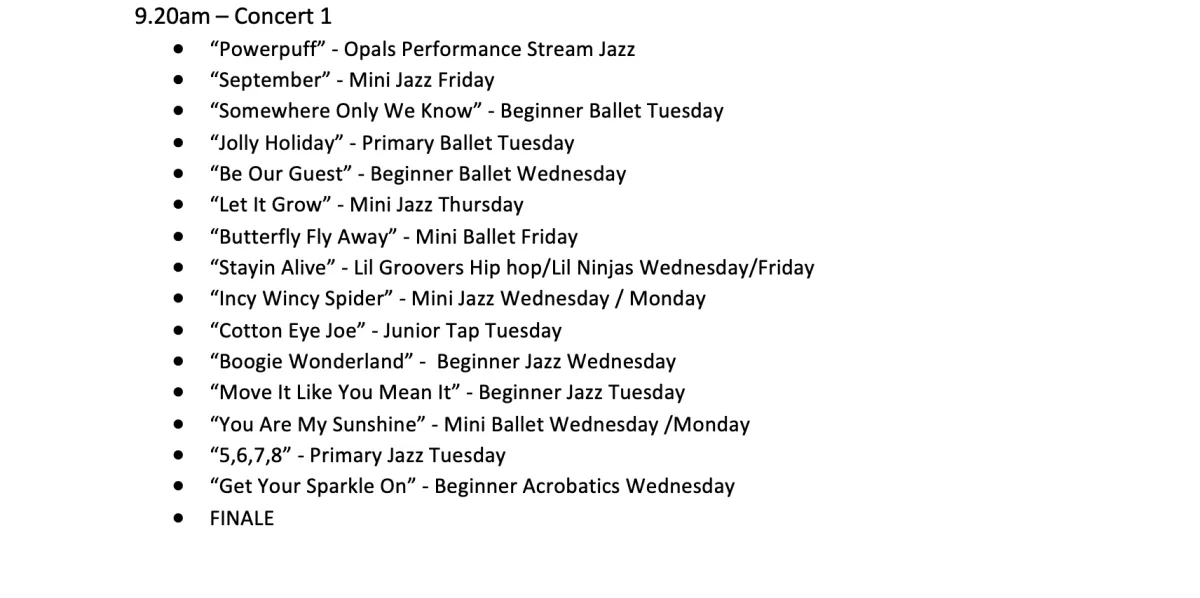 If you child's class is scheduled for more than one concert they MUST be in attendance for both performances. It is not possible to create two different versions of the one routine and would put a lot of pressure on other students.